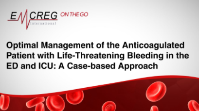 /This EMCREG-International On the Go program serves as a state of the art description of the management life-threatening bleeding in anti-coagulated patients using a case-based approach. The faculty members presenting in this symposium are experts in Emergency Medicine, Neurocritical Care, Cardiovascular Critical Care, and Trauma and Acute Care Surgery. Through this critical care approach to the evaluation and treatment of life-threatening bleeding in anti-coagulated patients, clinicians caring for these patients in the acute care setting (ED and ICU) will be better prepared to manage them. The first three faculty members will discuss the indications for anticoagulation and the pharmacologic agents used for anticoagulation as well as the general approach to anti-coagulated patients with life-threatening bleeding including the use of reversal agents, and will outline the process of developing a hospital-based critical pathway for treatment of life-threatening bleeding in anticoagulated patients. The remainder of the faculty will used case-based presentations to discuss the management of anti-coagulated patients with bleeding associated with significant morbidity and mortality, including intracranial, intraspinal, and gastrointestinal bleeding, bleeding in the cardiovascular ICU and patients receiving ECMO, and bleeding in traumatized patients presenting to the ED requiring surgical treatment and care in the surgical ICU.